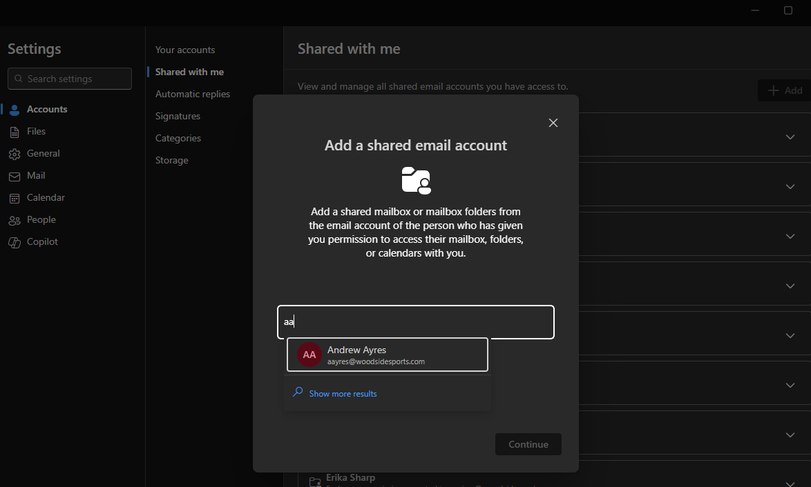 - Enter the account name of the mailbox you want to add and click continue.